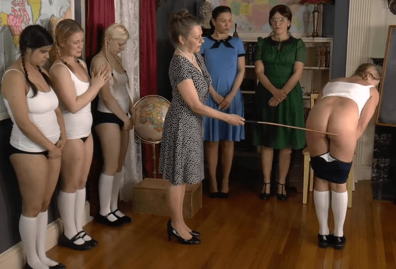 Scene 8: The final part is scene 8 and this includes caning for all the students as well as an OTK wooden spoon spanking. The Strictmoor students have all earned enough demerits in their time at the academy which means a caning. Each naughty girl gets 6 strokes of the cane on their bare bottoms at the hands of Miss Baker. They are told to look at themselves in the mirror and watch as each stroke hits their bottom. After their caning they are each told to take off their outer layer of pinafore, shirt, and tie and strip to only a camisole, knickers, and socks. They go over Miss Honeysuckles lap for a swift hard wooden spoon spanking on their already sore caned backsides. They again have to look at themselves in the mirror as they receive their punishment. After a final scolding and tearful stained faces they are sent off to prepare to go back home the next day.